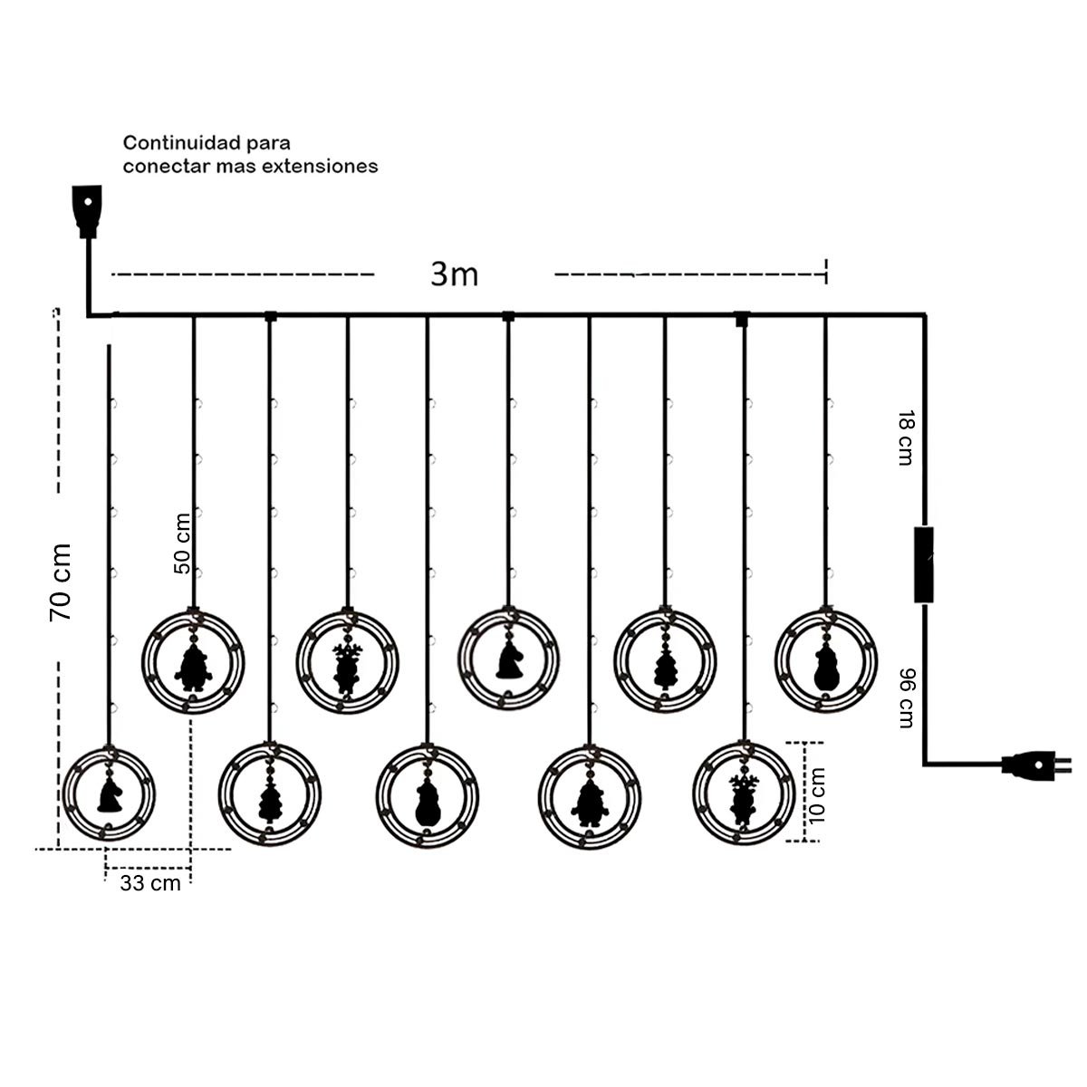 Tamaño Aprox.: Largo: 3 m / Cantidad de tiras: 10 tiras / Caída de la tira: Larga: 70 cm – Corta: 50 cm / Cantidad de luces: 100 LEDS. / Distancia entre tiras: 33 cm.